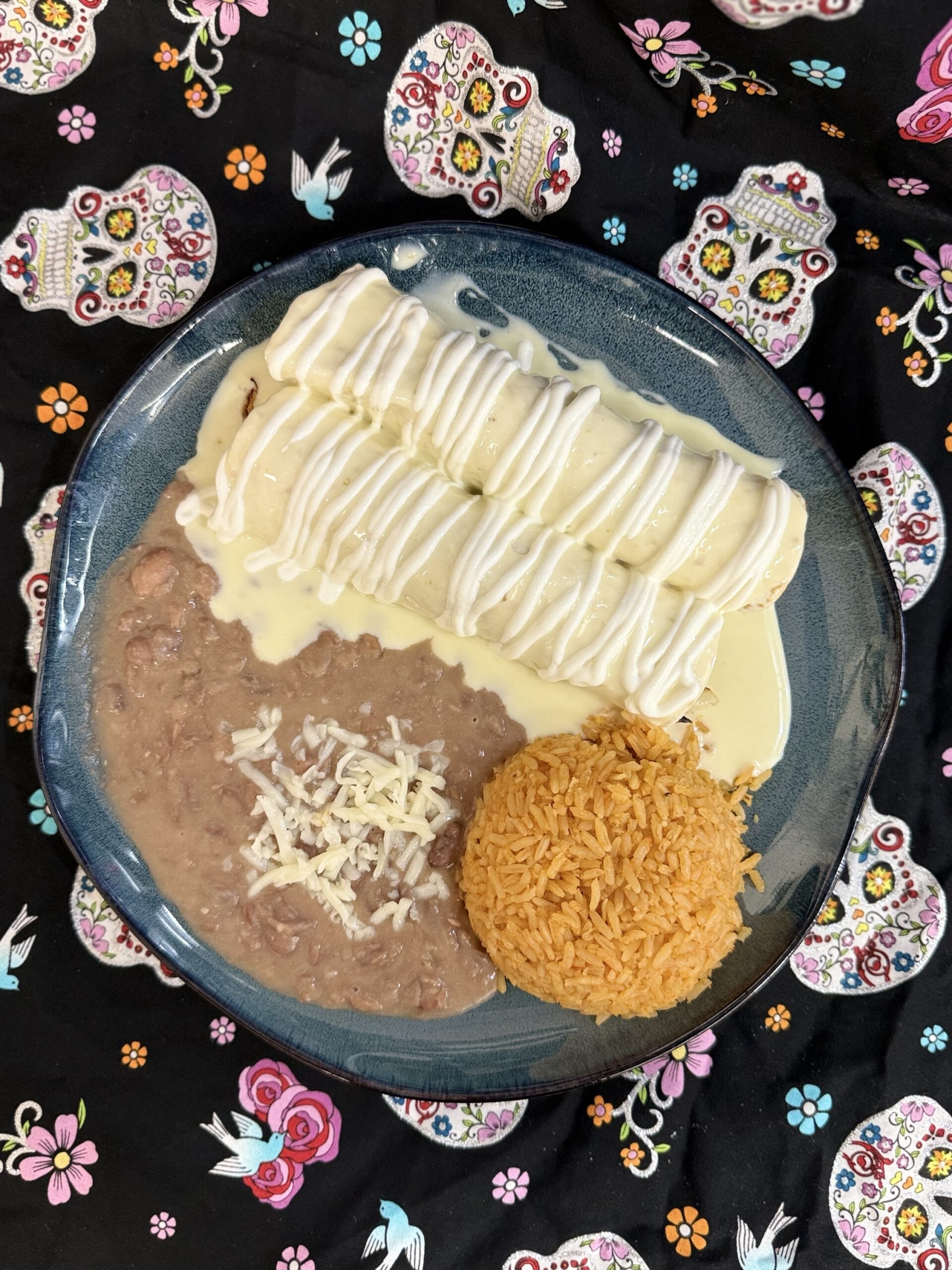 Two burritos, one with shredded chicken, and beans, and one with ground beef, and beans, topped with red salsa, lettuce, pico de gallo, and sour cream, served with a side of rice or beans.