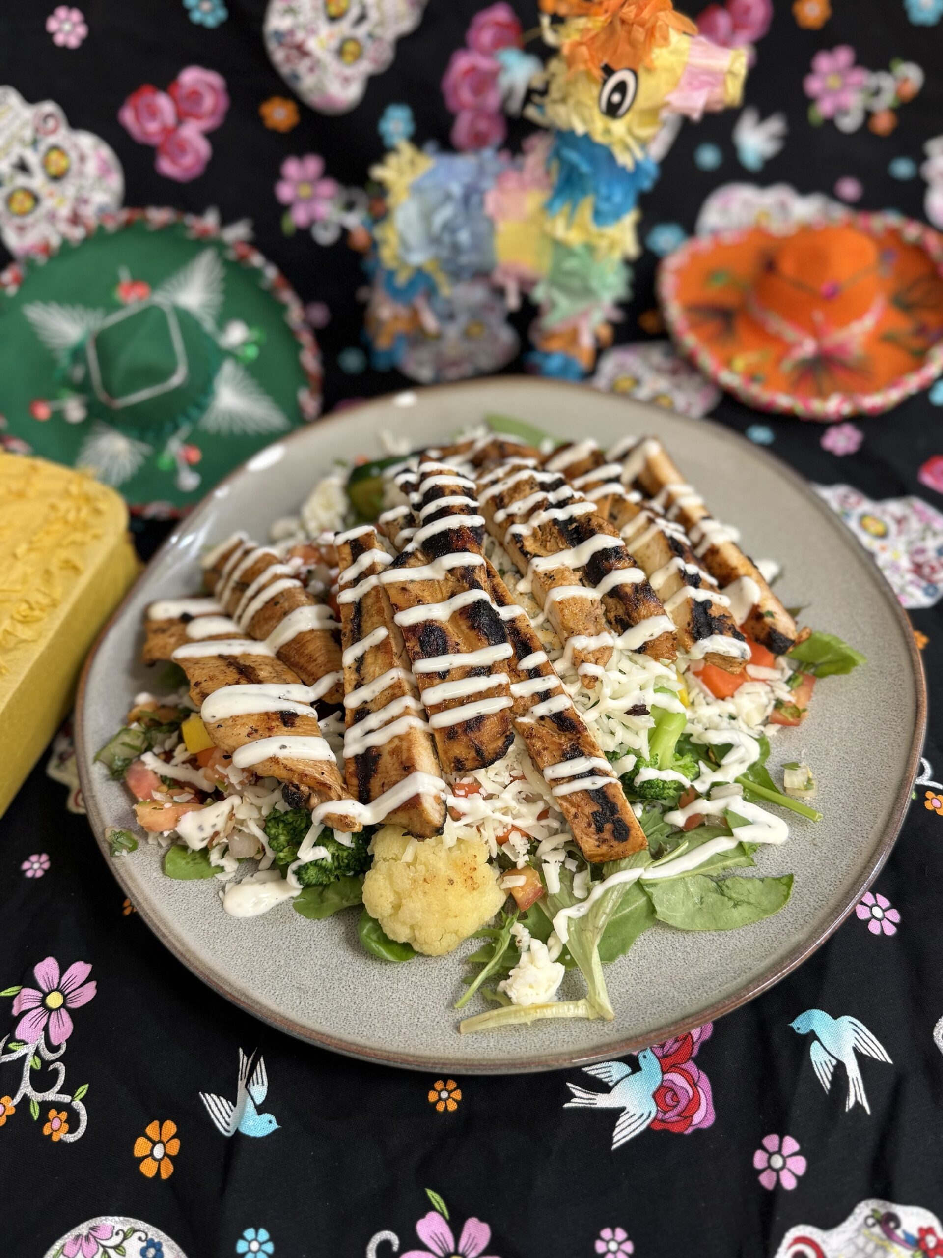 Your choice of grilled chicken, or steak, salad made with lettuce, fresh pico de gallo, cucumber, corn, cheese, topped with ranch dressing.